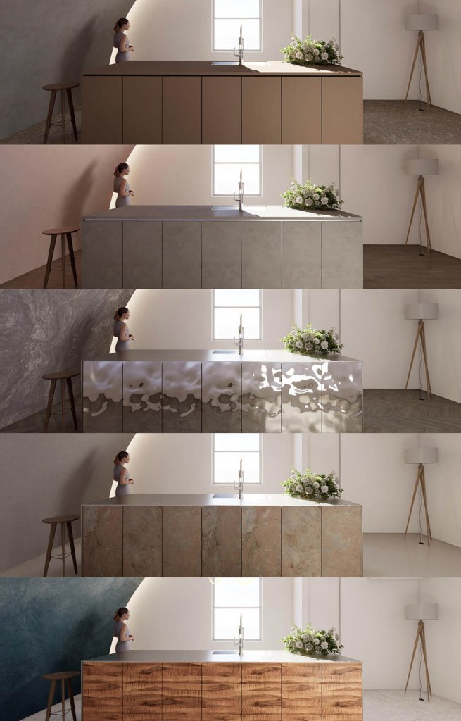 CGは2種類で、こちらは着せ替えのアイデアです。右上のアイコンを押すと、扉の面材(まだ全てダミーですが)が切り替わる仕組みになっています(こちらのブログでは全てを並列に並べた画像です)。